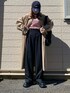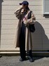 トレンチコートに赤ボーダーのロンTにスラックス. キャップにボリューム感のあるブーツを合わせてメンズライクに.
