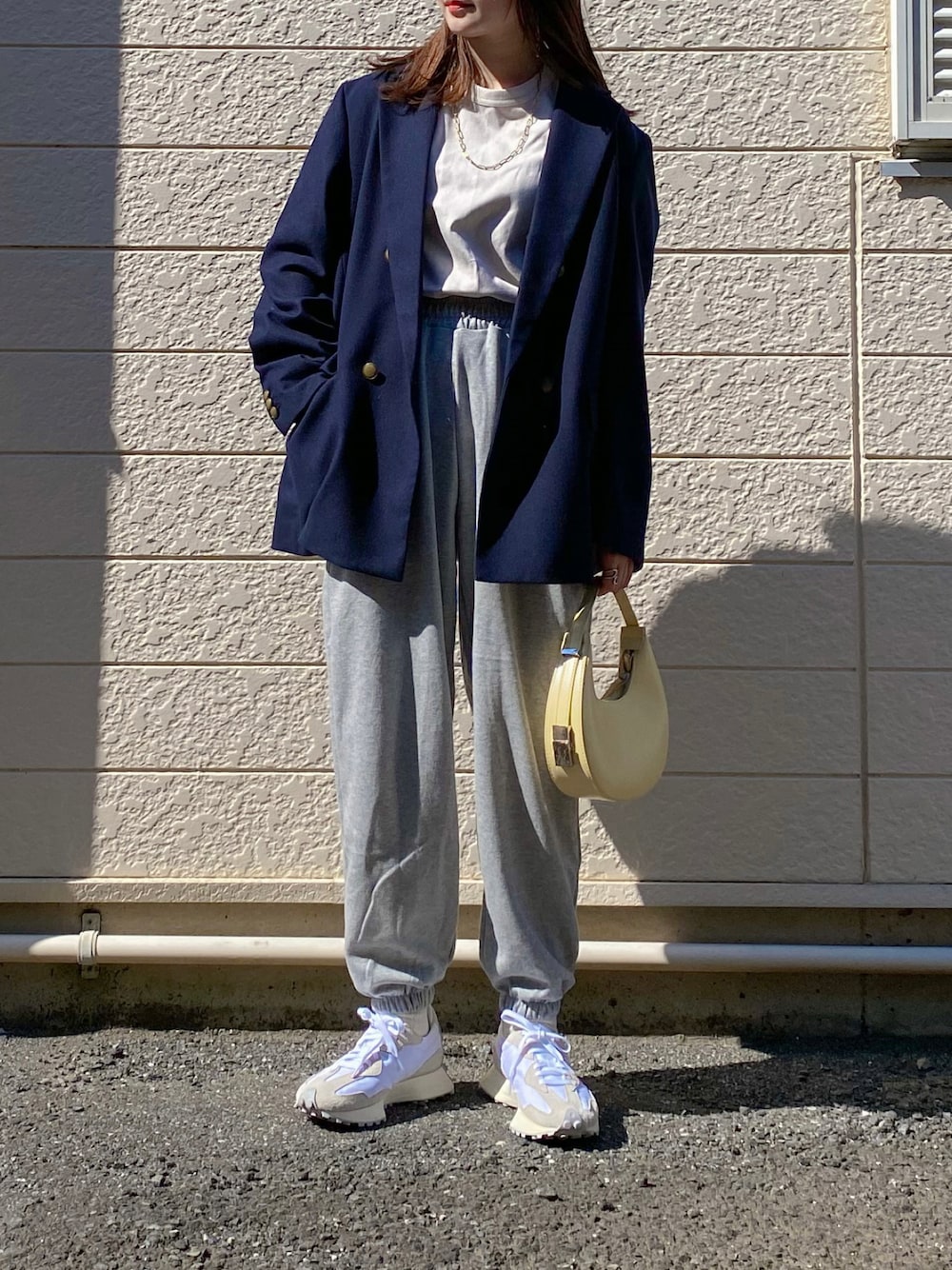 ジャケットにグレーのスウェットパンツ. SONYUNARAの バンディング神ジョガーパンツ. 商品名に神が入っているだけあって 形がすっごくきれい◎ スウェットだから履き心地も抜群. ジャケットと合わせるとカジュアルすぎず大人っぽいコーデに🦕