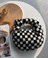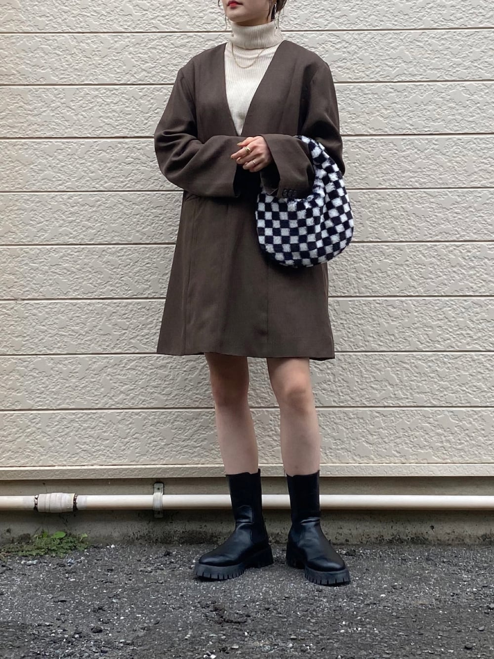 ジャケットワンピースにタートルネックにチェックのファーバッグ. as know as plusの ラウンド ファーバッグ. シンプルなコーデも このバッグが程よいアクセントに◎ 何よりファーの触り心地が最高なんです🫶