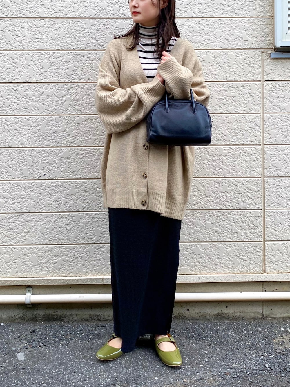 Vネックのニットカーディガンにボーダーのタートルネックニットにロングスカート. ANGIEの オーバーサイズVネックニットカーディガン. ベージュを含め新しく3色が仲間入りしました🫶 オーバーサイズでゆるっと着られるのが私好み◎