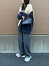 ロゴスウェットにタックワイドパンツにニットを肩がけ.