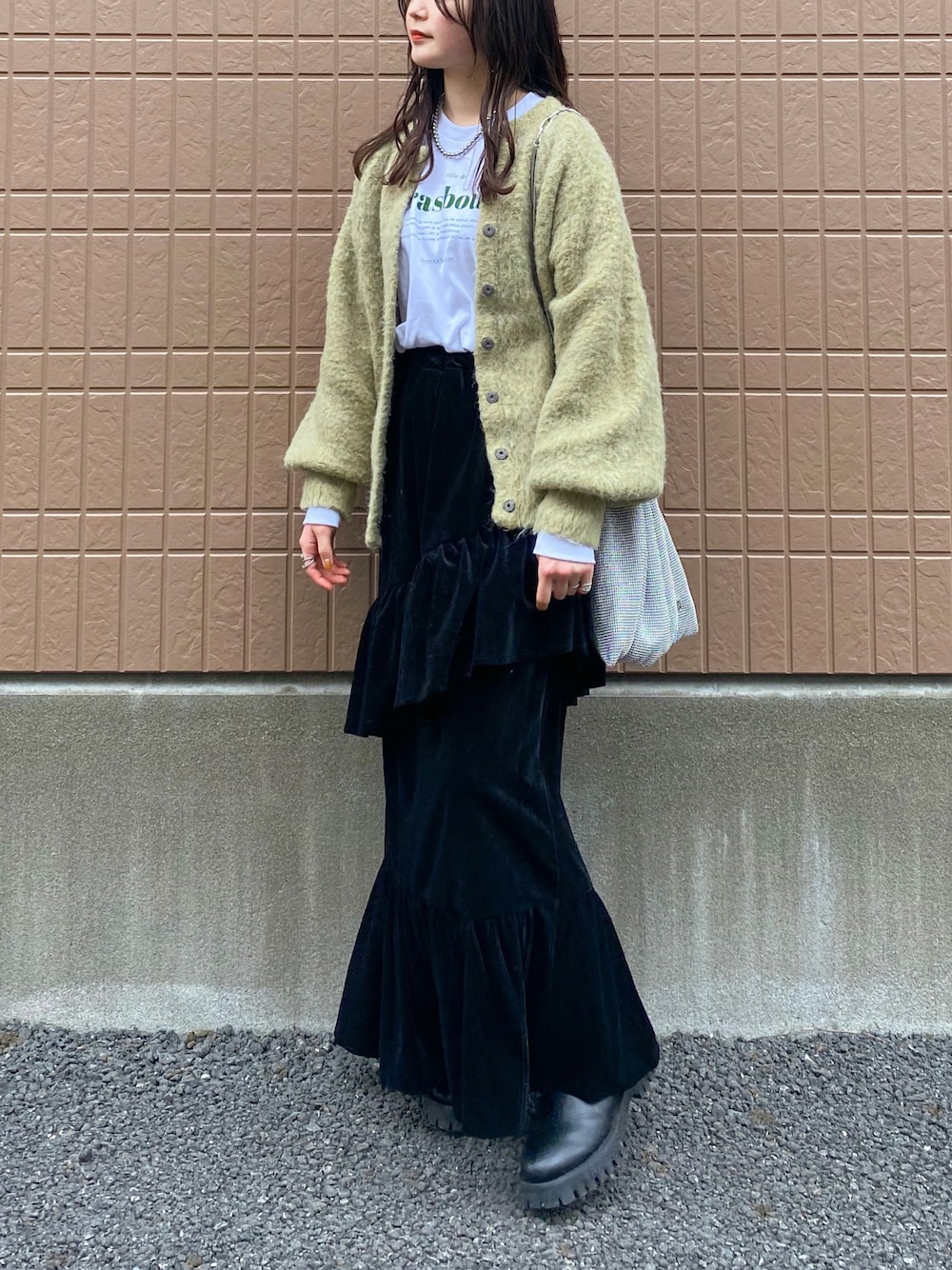 シャギーニットのカーディガンにロゴロンTにベロアのマーメイドスカート.