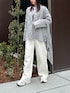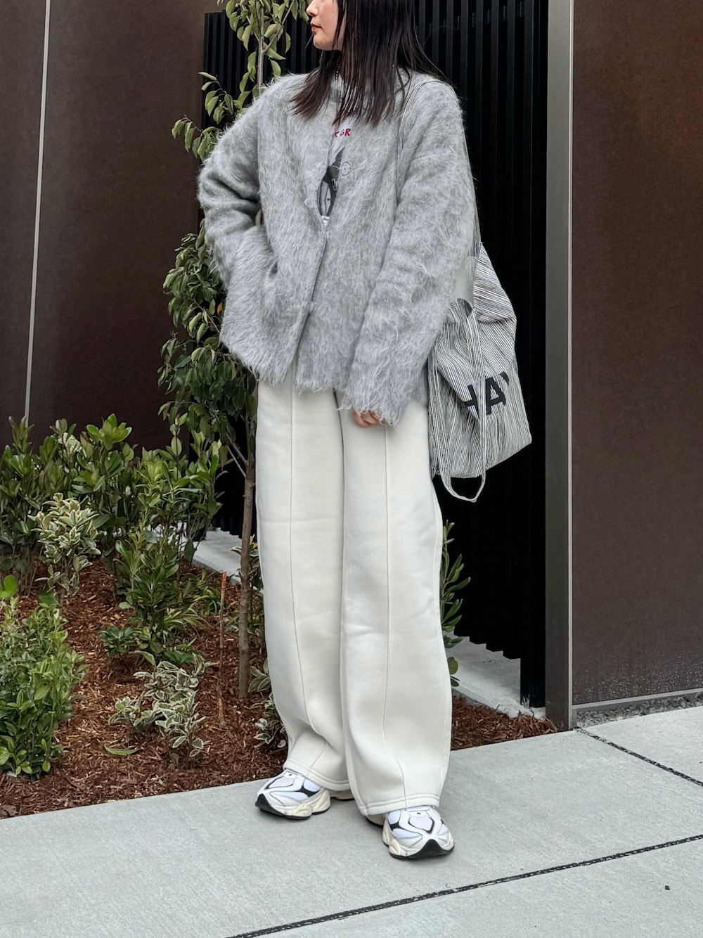 シャギーニットのカーディガンにロゴロンTにスウェットパンツ.