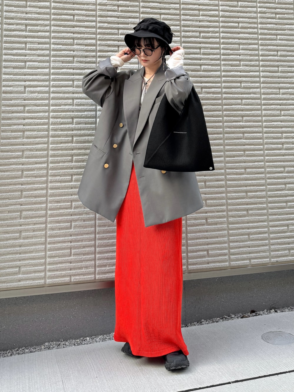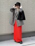 ジャケットにビタミンカラーのペンシルスカート. きれいめになりすぎないように バケハとスニーカーでカジュアルダウン◎