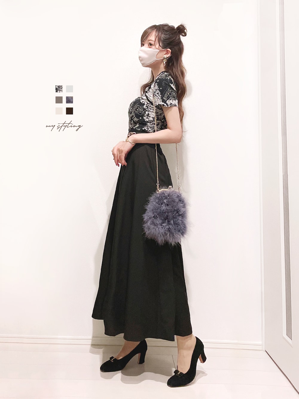 ふわふわファーバッグが主役💭 ペイズリー柄のチャイナトップスも かわいい〜🐼🇨🇳