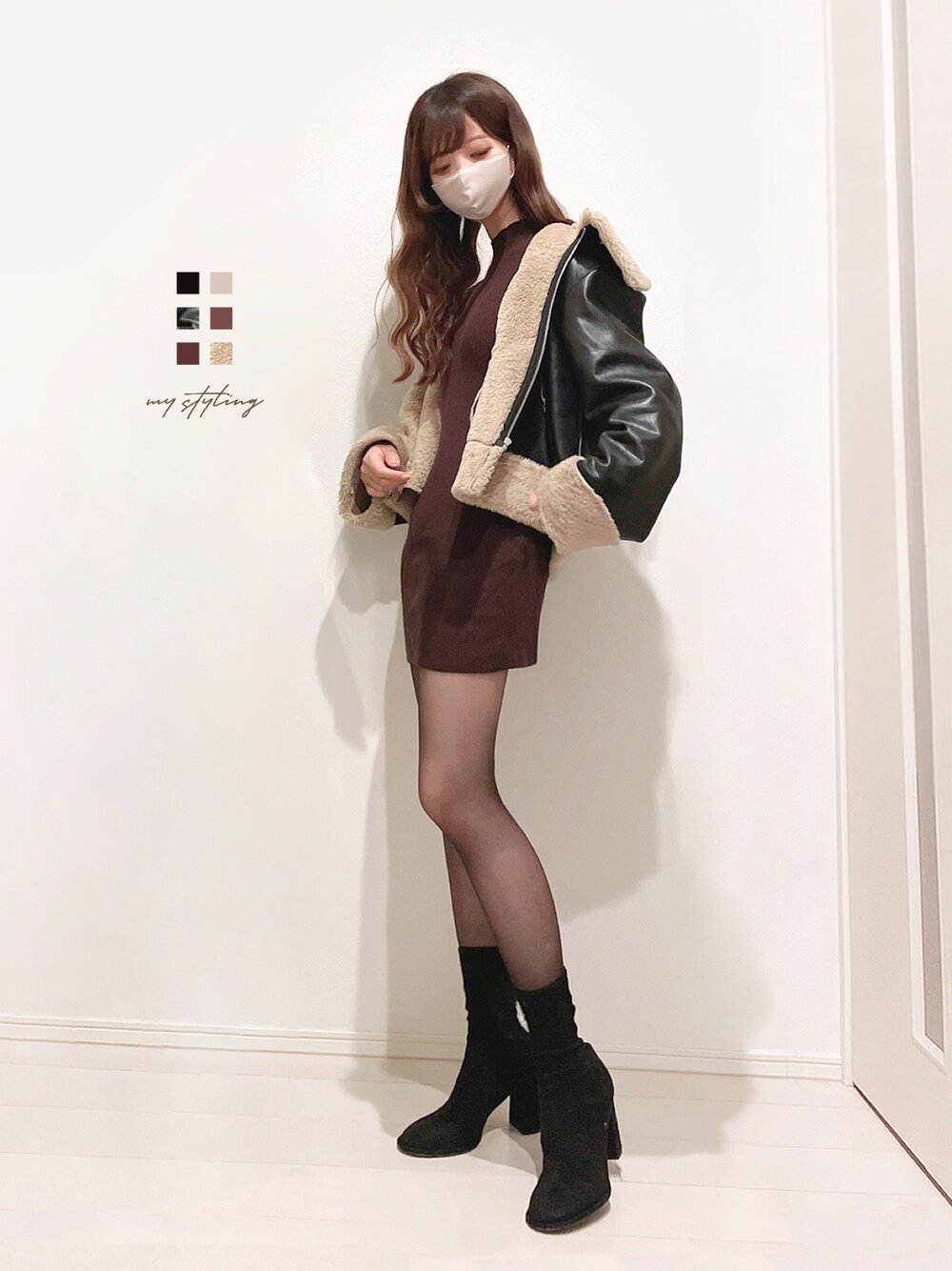 ビッグシルエットのアウター× ミニ丈ニットワンピの日🐼 アウターは中がモコモコであったかいから 真冬も着ちゃいます❄️