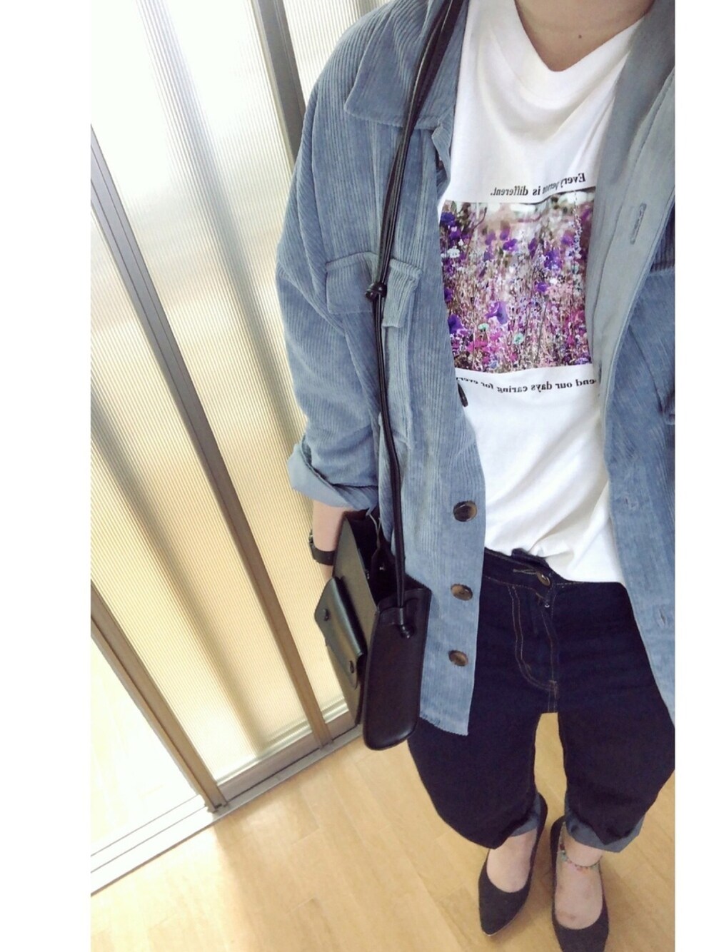 こんばんは! 見に来て下さった皆様 ありがとうございます😄💗 今日は、ブルーグレーの コーデュロイシャツで秋コーデ💖 インナーは、しまむら❗️¥850なり🤣