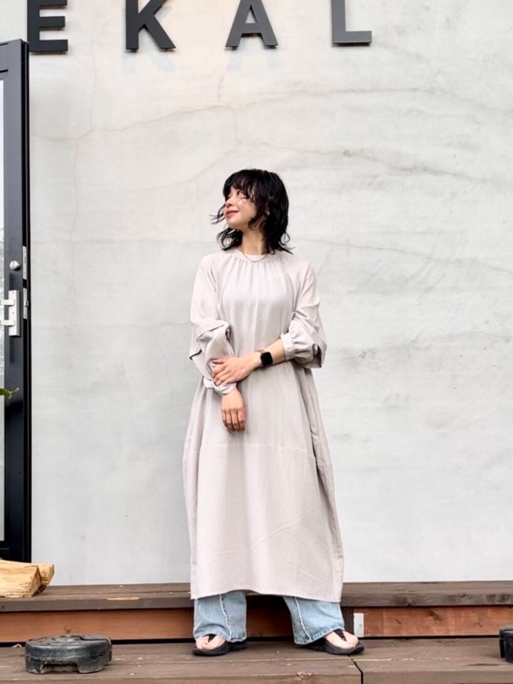 asano(KBF 名古屋パルコ)のワンピース「ボリュームスリーブコクーンワンピース」を使ったコーディネート