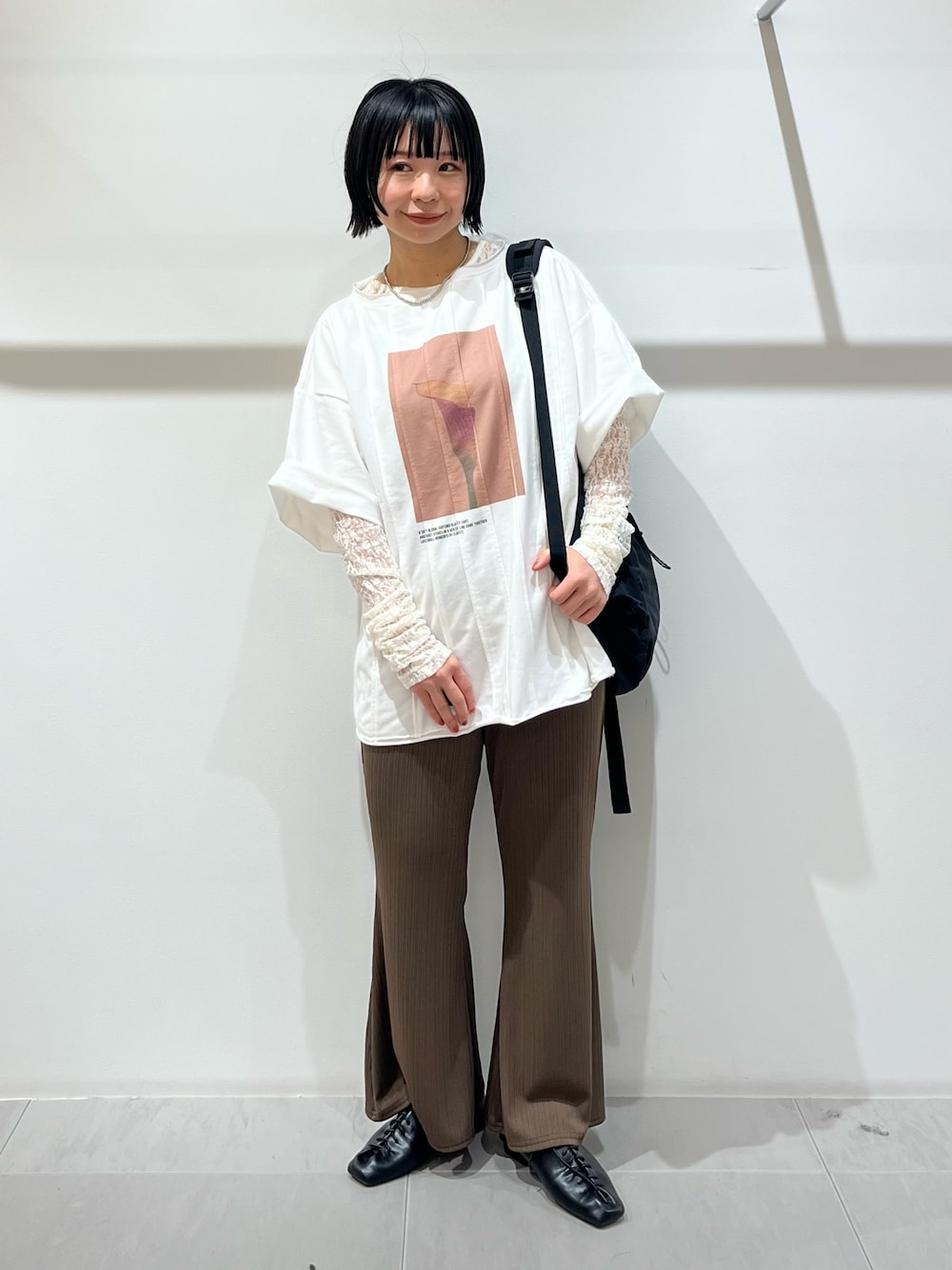 157センチ 骨格ウェーブ イエベ春 ⚪︎ピンタックフォトプリントTEE お袖はひとまくりしています。一気にスッキリします!首回りが少し立っているので、インナーとのレイヤード、バランスとりやすいです✨ ⚪︎イージーRIBフレアパンツ よく伸びよく歩けます。ボディラインは拾うため、わたしは太もも半分まであるBIGサイズと合わせる専門パンツ派です!