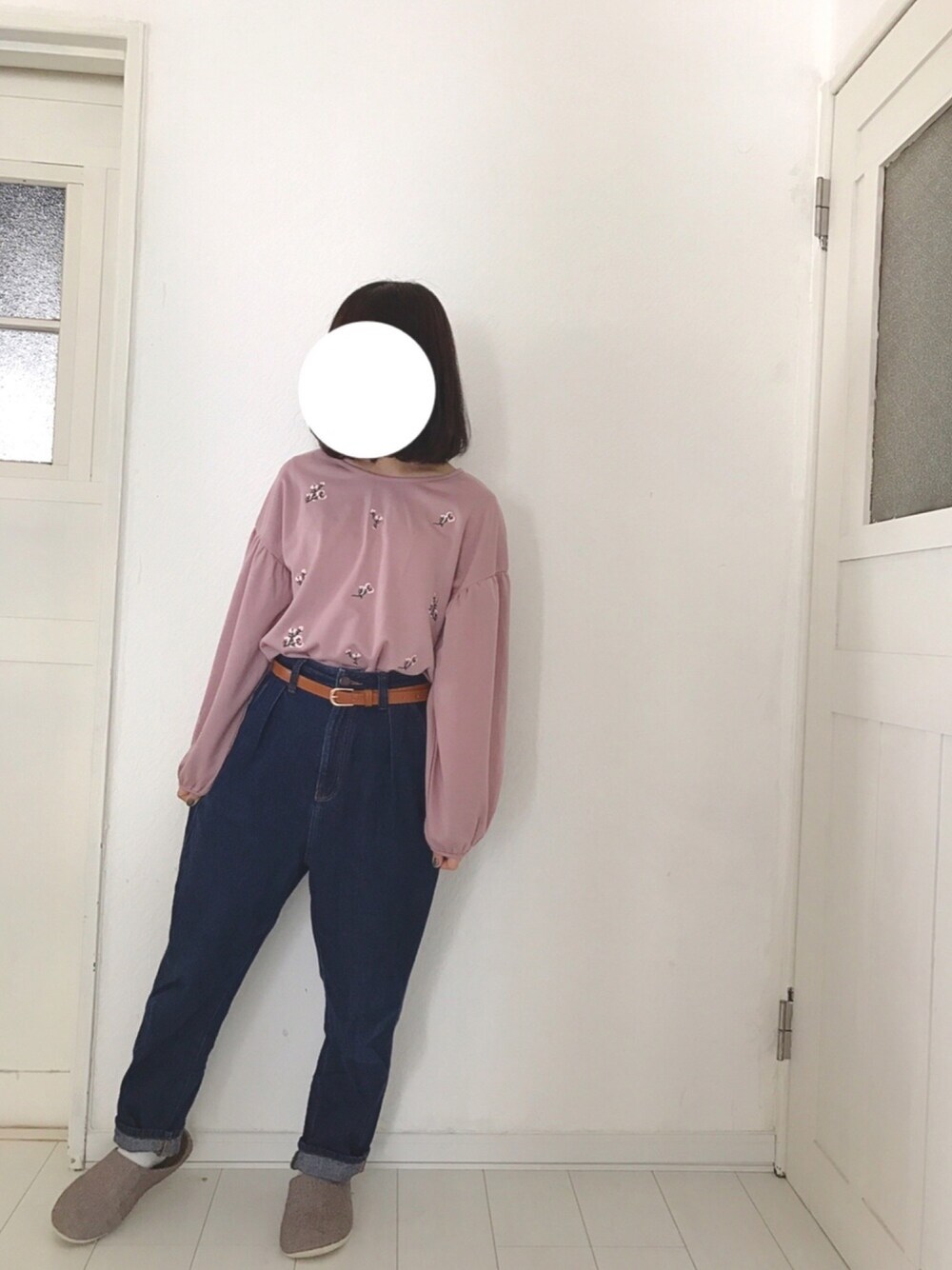 今日 . 社販したての花刺繍プルオーバー . 袖がきゅってなっててかわいい . 写真撮ってからベルトのダサさに気づいたから、guの黒いベルトに変更したよ .