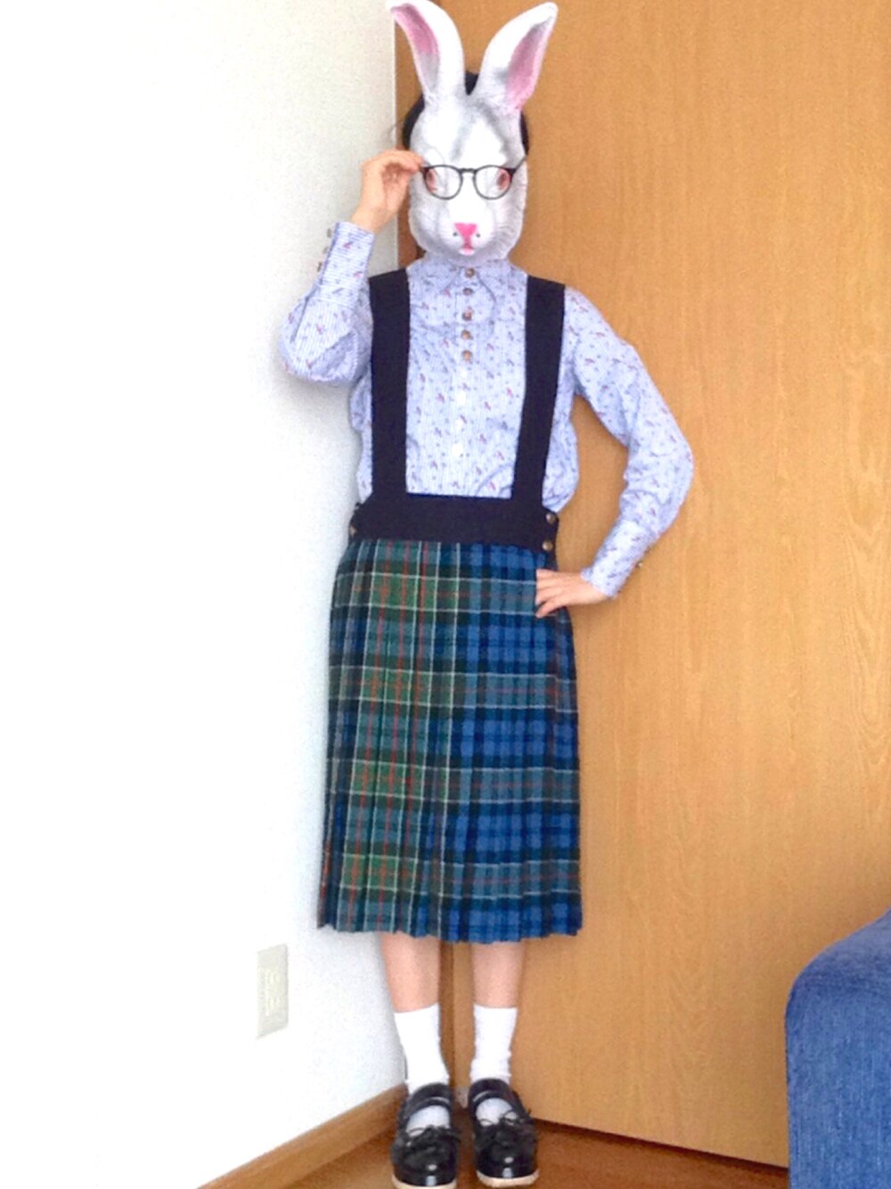 学生に戻りたい衝動。 なで肩だからタスキが落ちてくるのだ。 ブラウス: tricot COMME des GARCONS スカート: tricot COMME des GARCONS