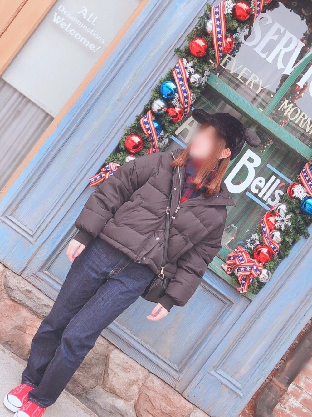 初投稿です。いつの日かのディズニーコーデ。 jouetieのダウンは合わせやすいし軽いしこの冬大活躍でした。 guのハイウェストデニムもヘビロテしてます。