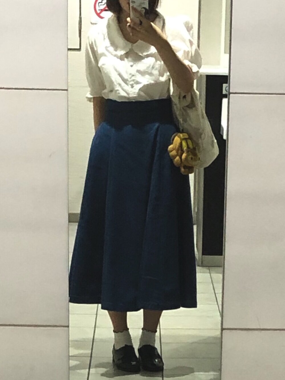 白ブラウス×デニムスカートで定番コーデ.*・゚ ブラウスの襟が大きめで可愛いです😍