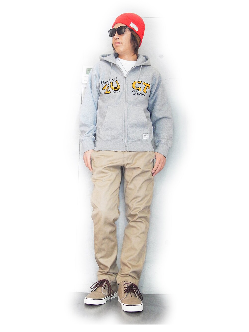 FUCT SSDD 2014 春夏新作アイテム「FUCT SSDD GOOD CHARM HOOD」 にBLUCOワークパンツで春のストリートコーディネート。 パーカー、Tシャツ、パンツ共にSサイズを着用しています。