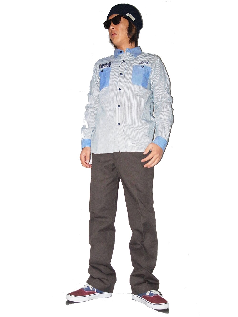 PEEPS 春のストリート ワーク コーディネート。 FUCT SSDD ヒッコリーシャツにDEFSTEEZ. ジーンカットワークパンツ。 シャツ Sサイズ パンツ W30を着用しています。