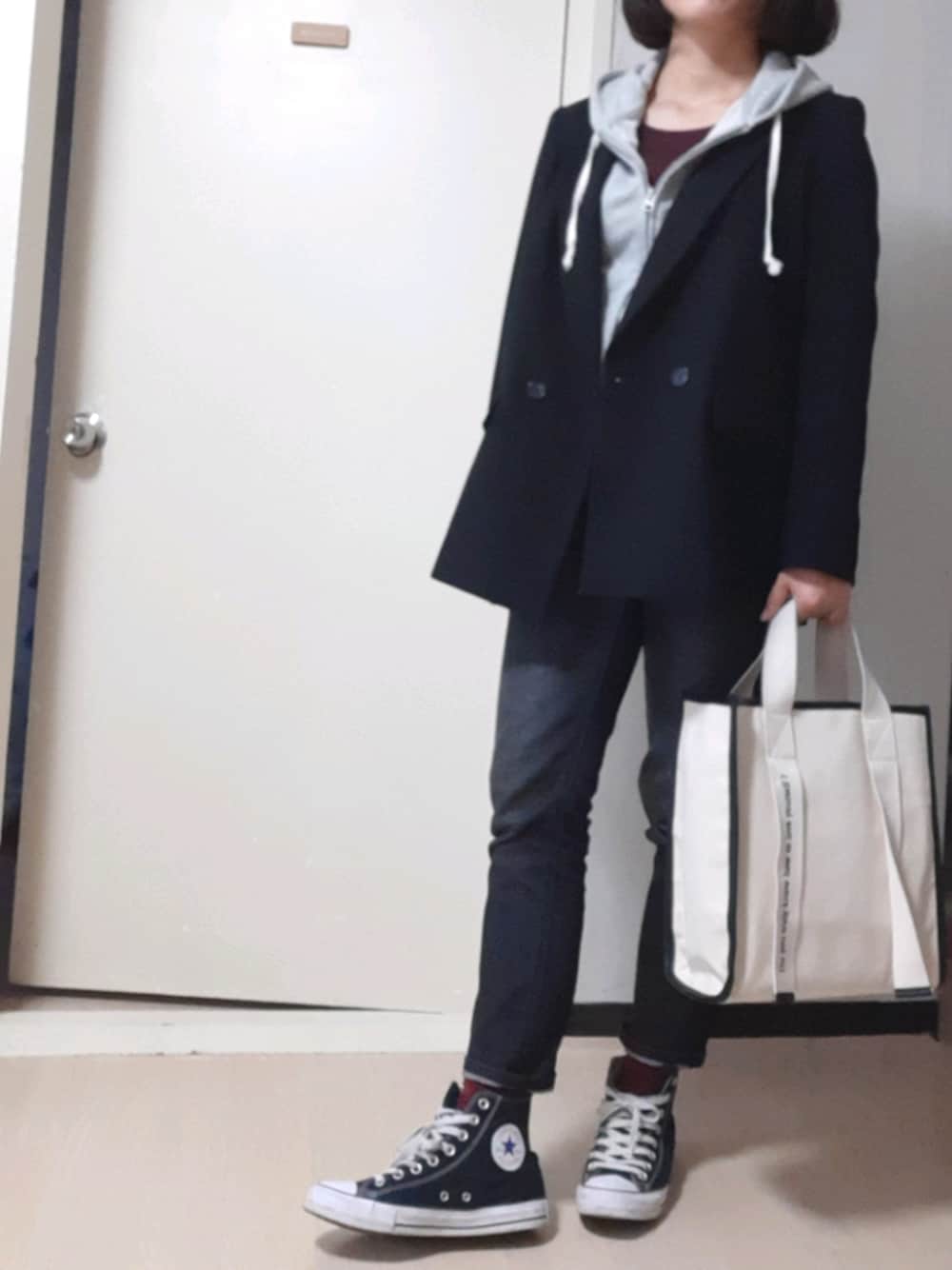 ジャケット×パーカー。Tシャツと靴下のバーガンディがポイント。