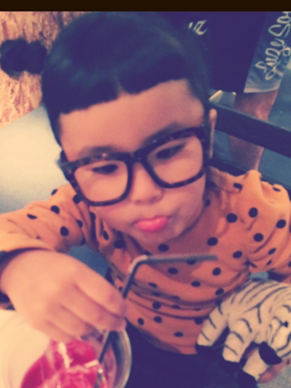 お気に入りのぬいぐるみをもって 水分補給❤️ レンズが邪魔なので外して フレームのみにしました^ ^