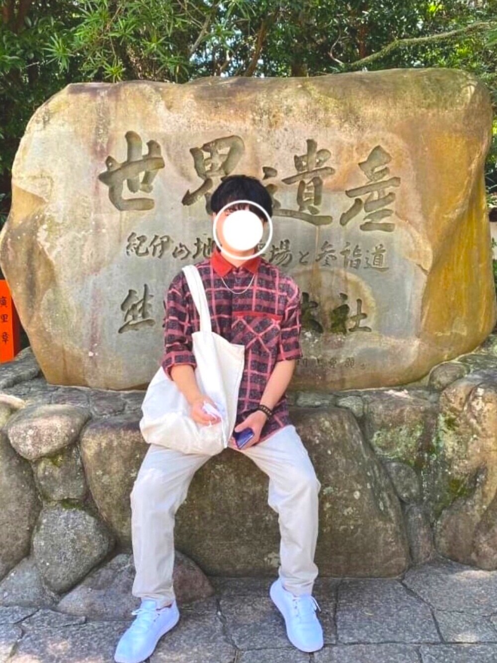 赤の派手な柄シャツに白のシェフパンツを組み合わせたコーデ バックや靴もホワイト系で統一