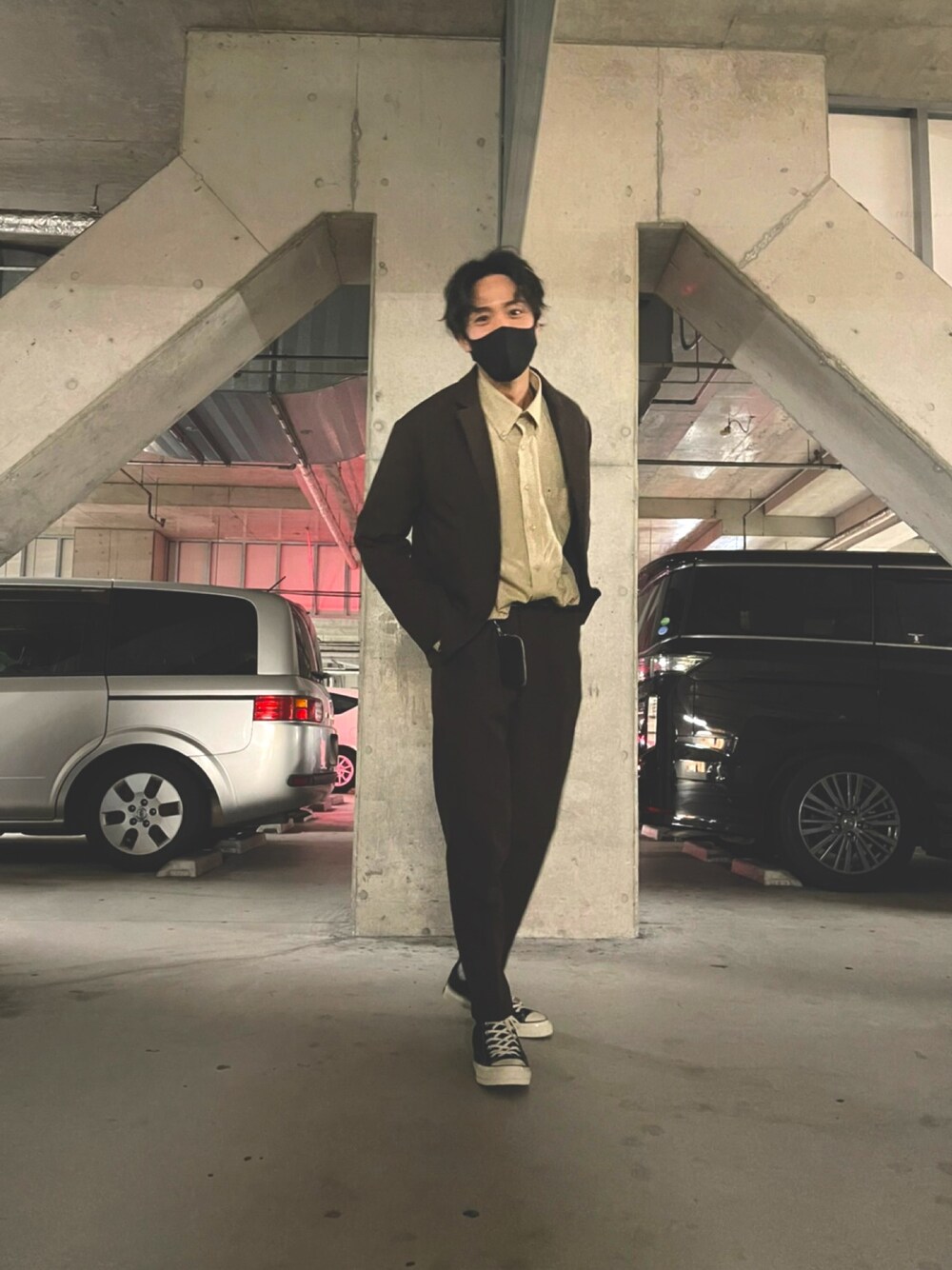 このセットアップ7000ちょっとやけど生地しっかりしてるし、シワなりにくいし脚長く見えるしおすすめやねん!