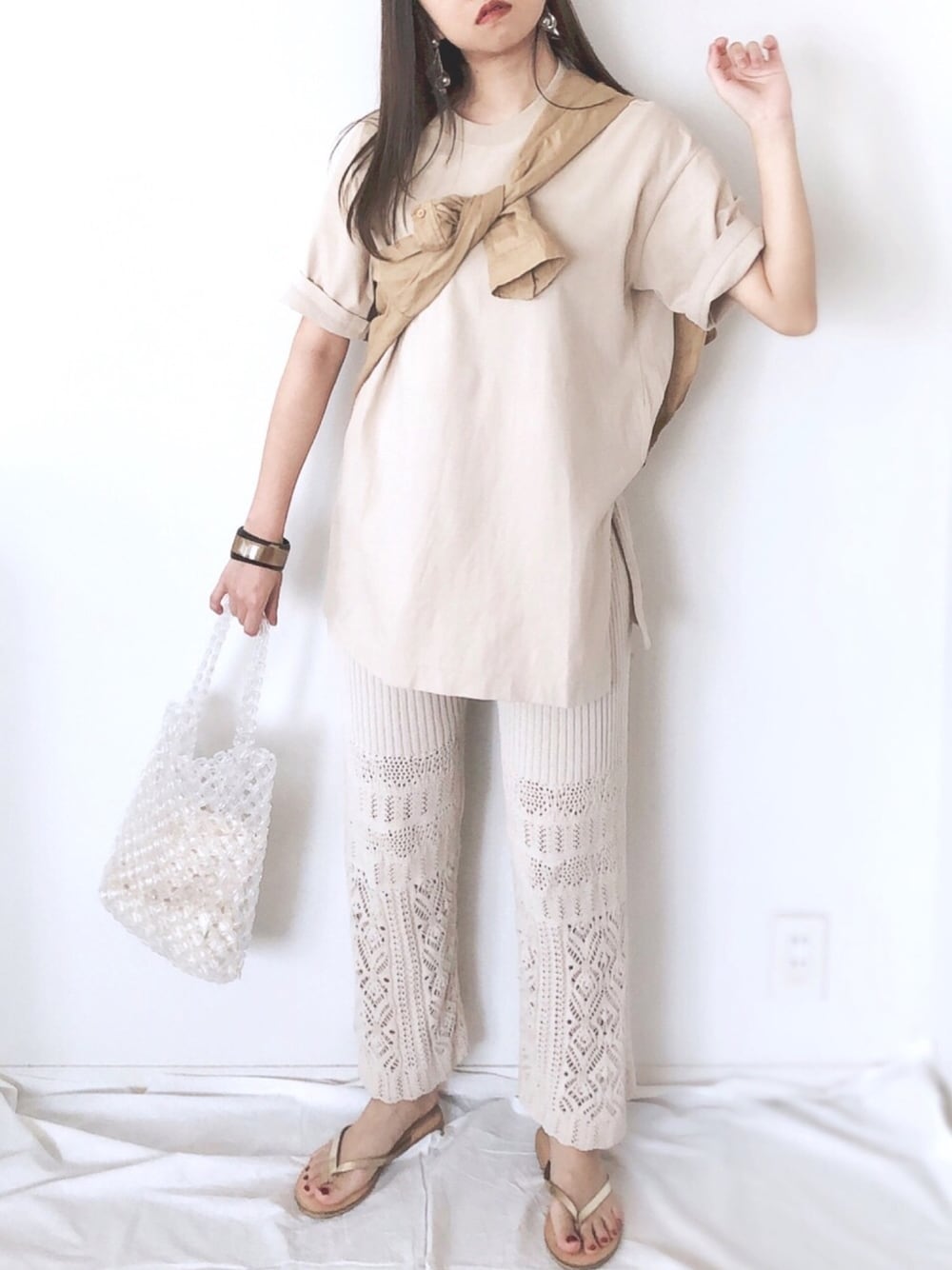 ベージュのワントーンコーデ🐒🐒 透かし編みのパンツはラクだし 風とおすから涼しくて最高です❤︎ 今年はハーフパンツが欲しい…🙊 いいね、save、フォロー いつもありがとうございます¨̮♡⃛ フォルダもとっても嬉しいです✨✨ Instagram➿@uyuyu_wear
