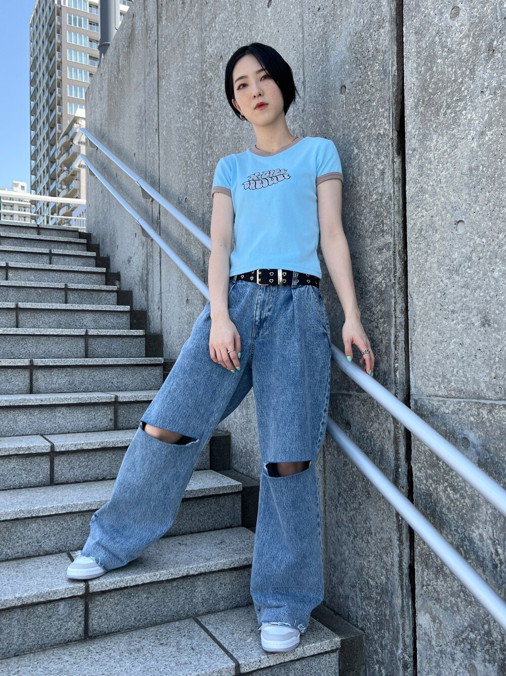 Emiru(XLARGE/X-girl新潟(X-girl))のデニムパンツ「KNEE SLIT WIDE LEG DENIM PANTS/ダメージジーンズ/ワイドデニムパンツ」を使ったコーディネート