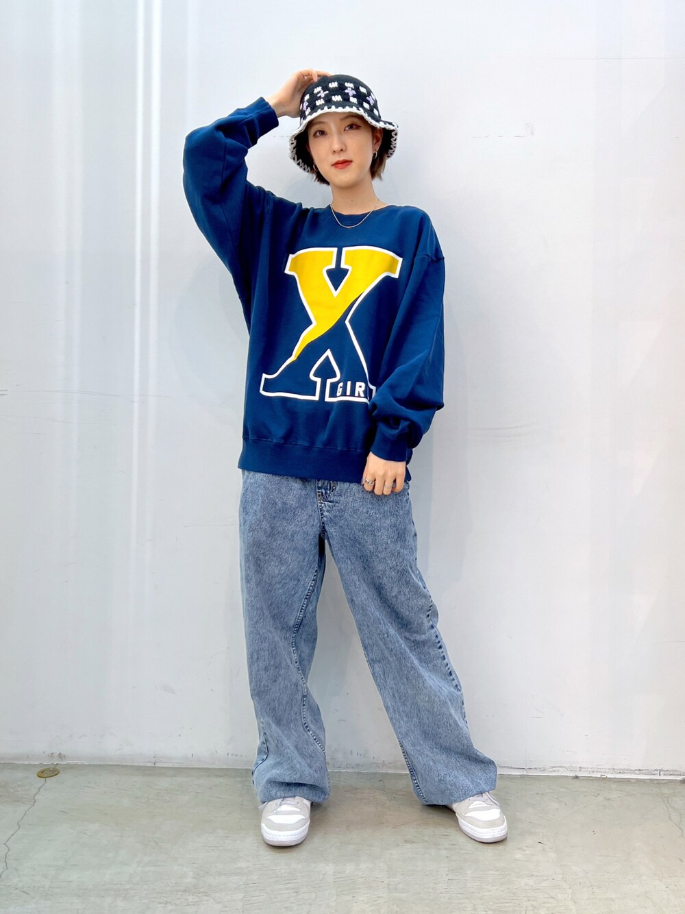 Emiru(XLARGE/X-girl新潟(X-girl))のデニムパンツ「CHEMICAL WASH DENIM EASY PANTS/ケミカルウォッシュ デニムイージーパンツ」を使ったコーディネート