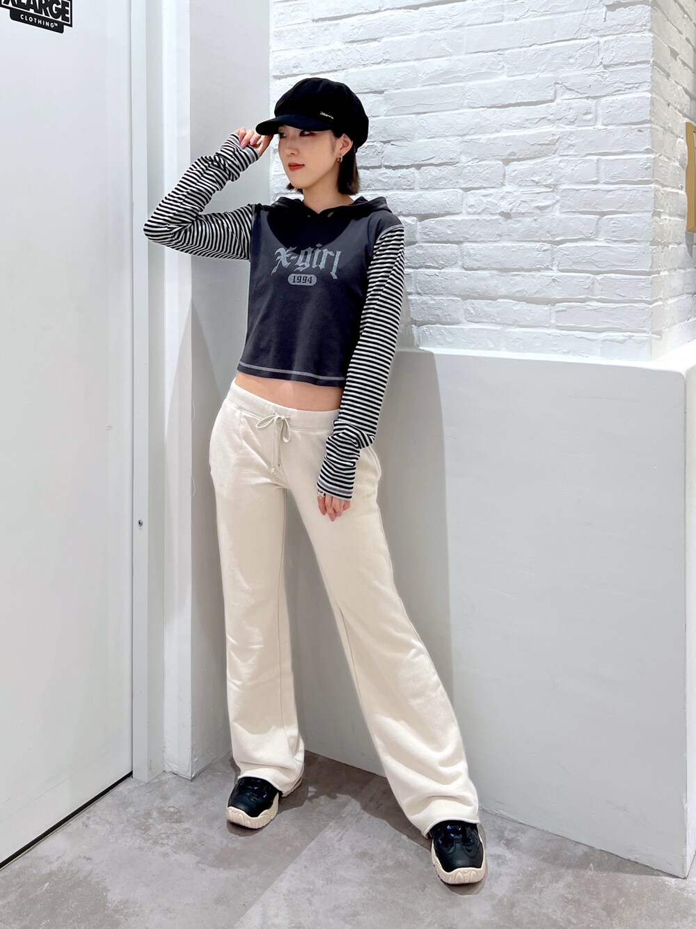 Instagram ▷ @pemi_513 【 165cm / 普段TOPS : M.L BTM : S.M 】 *TOPS : M 着心地最高です...♡ 袖が少し長めのデザインになっています✌︎ *PANTS : M ローライズのスウェットパンツは裾が切りっぱなしのデザインになっています! フレアシルエットなので脚長効果抜群☆