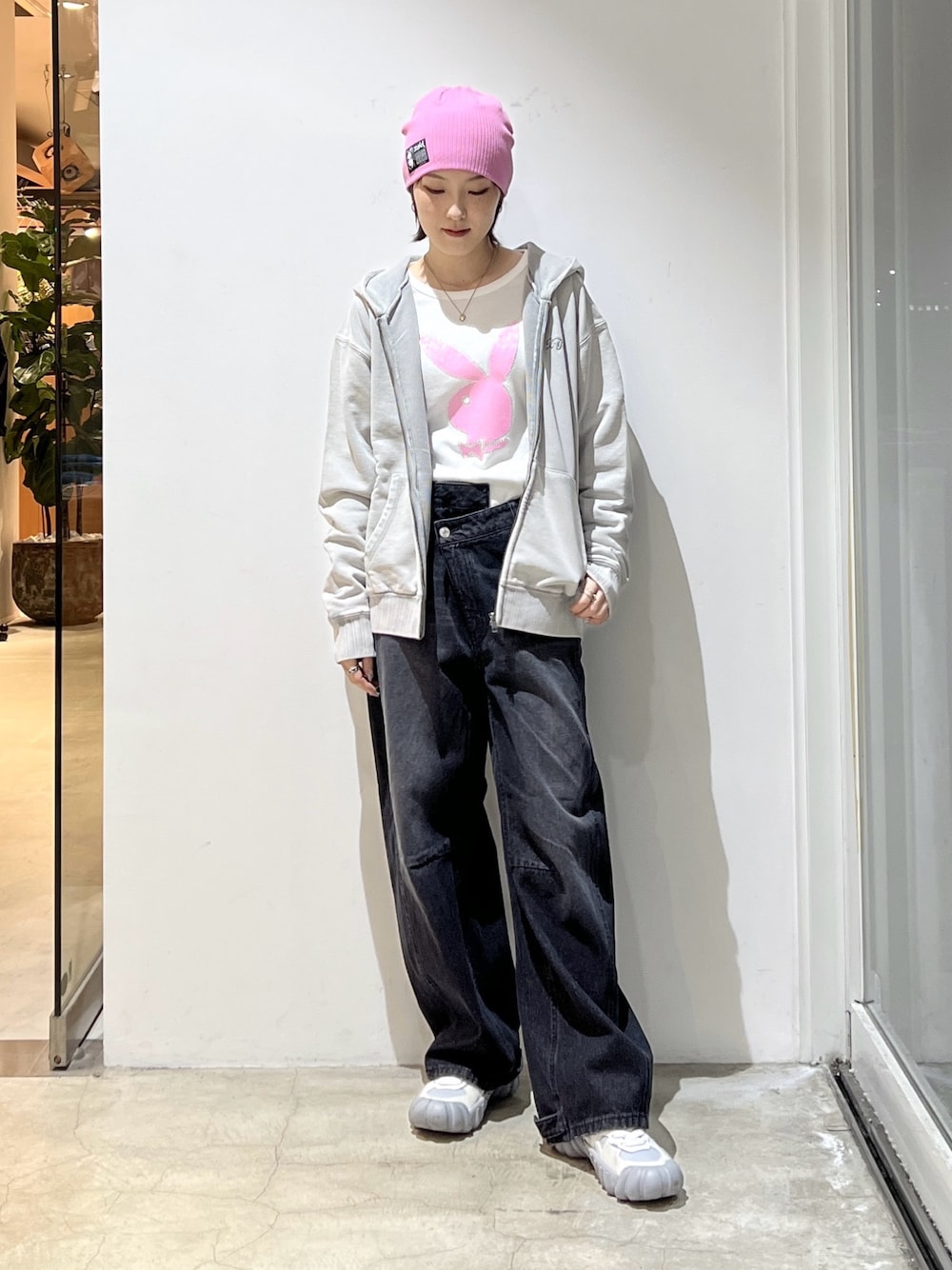 Emiru(XLARGE/X-girl新潟(X-girl))のデニムパンツ「ASYMMETRIC WAIST BARREL LEG DENIM PANTS」を使ったコーディネート