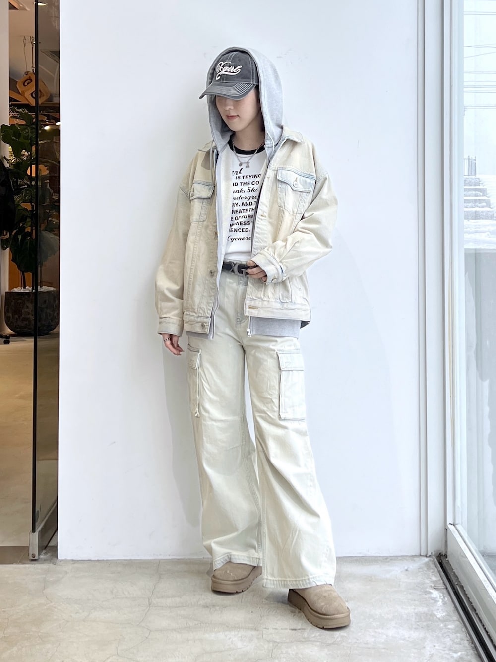 Emiru(XLARGE/X-girl新潟(X-girl))のデニムパンツ「CURSIVE LOGO DENIM CARGO PANTS」を使ったコーディネート