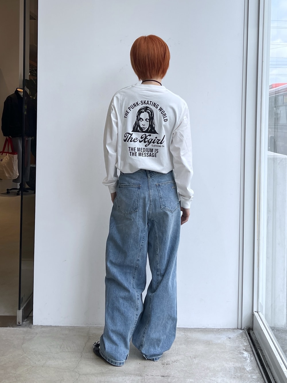 Emiru(XLARGE/X-girl新潟(X-girl))のデニムパンツ「ASYMMETRIC WAIST BARREL LEG DENIM PANTS」を使ったコーディネート