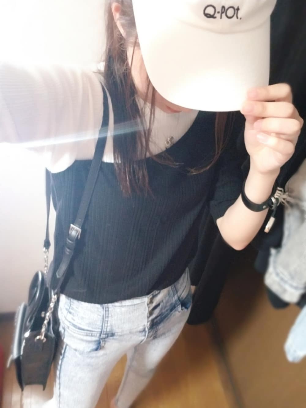 PAGEBOYでいろいろお買い物したので、 さっそくコーデに!! アシメデザインのトップス スタッズつきのショルダーバッグ Q-pot.の白キャップとHAREのレザーバングルもプラス😎 モノトーンコーデ 全部お気に入り♡