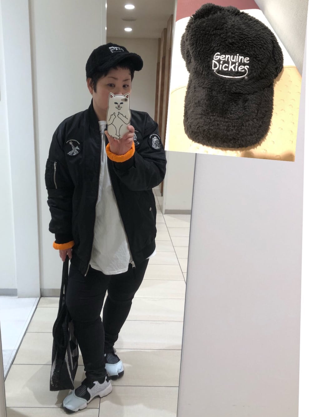 ステューシーのMA-1に championのビッグロンT ストリート寄り オーバーサイズコデ ディッキーズのボアキャップは 気に入り過ぎて グレーも買おうか迷い中〜 温か可愛いっす♡