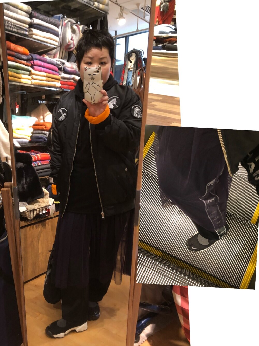 雨が止んで良かったですね〜 コデ オーバーサイズのパーカーに MA-1に kappaのジャージパンツ に チュールスカートを合わせたくて 見づらいですが 色 紫です(笑)