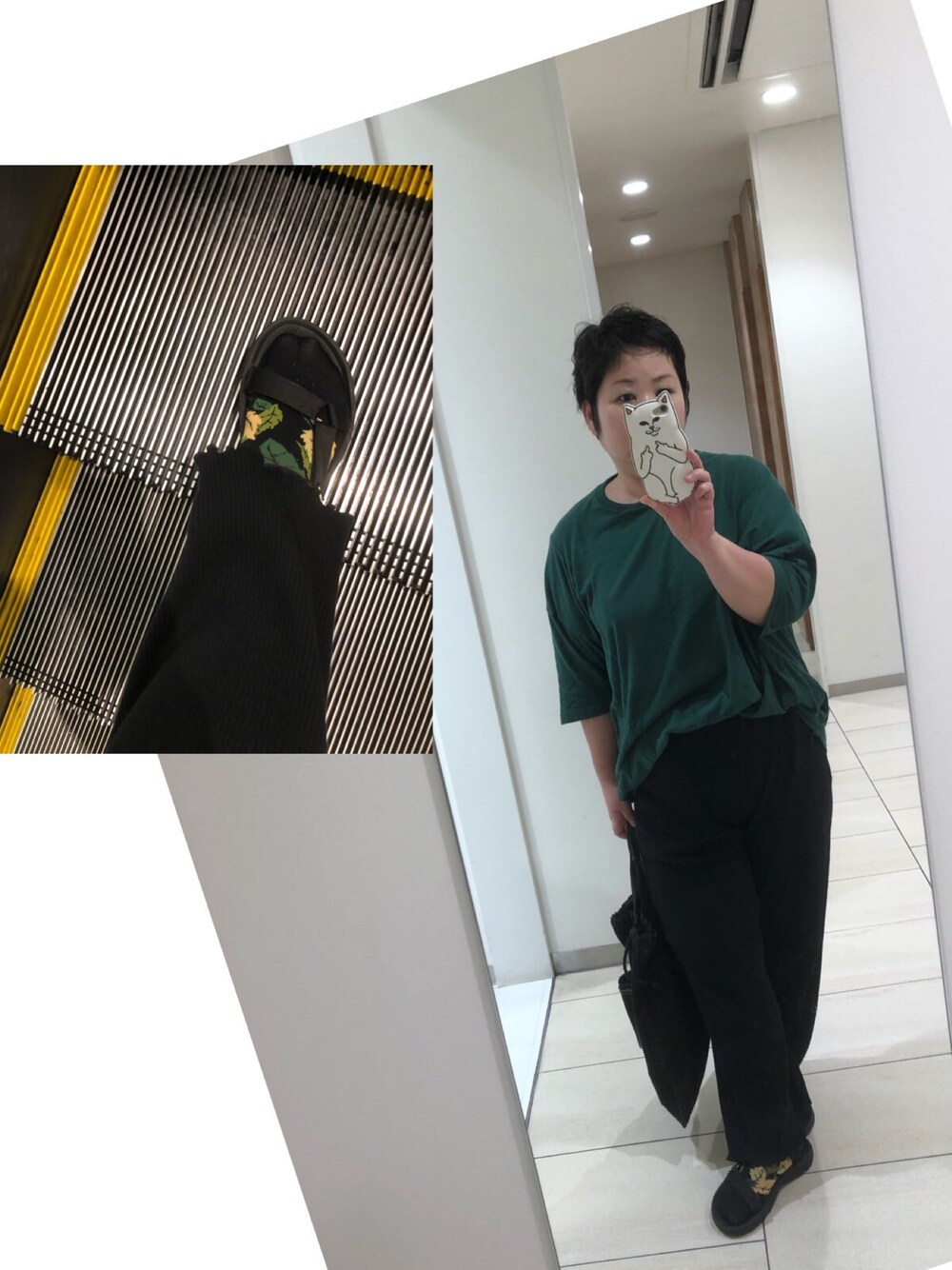 前回の グリーンTシャツを リブパンツに前だけIN してみますたコデ 秋になると履きたくなる 葉っぱ柄の靴下 合わせますた🍂