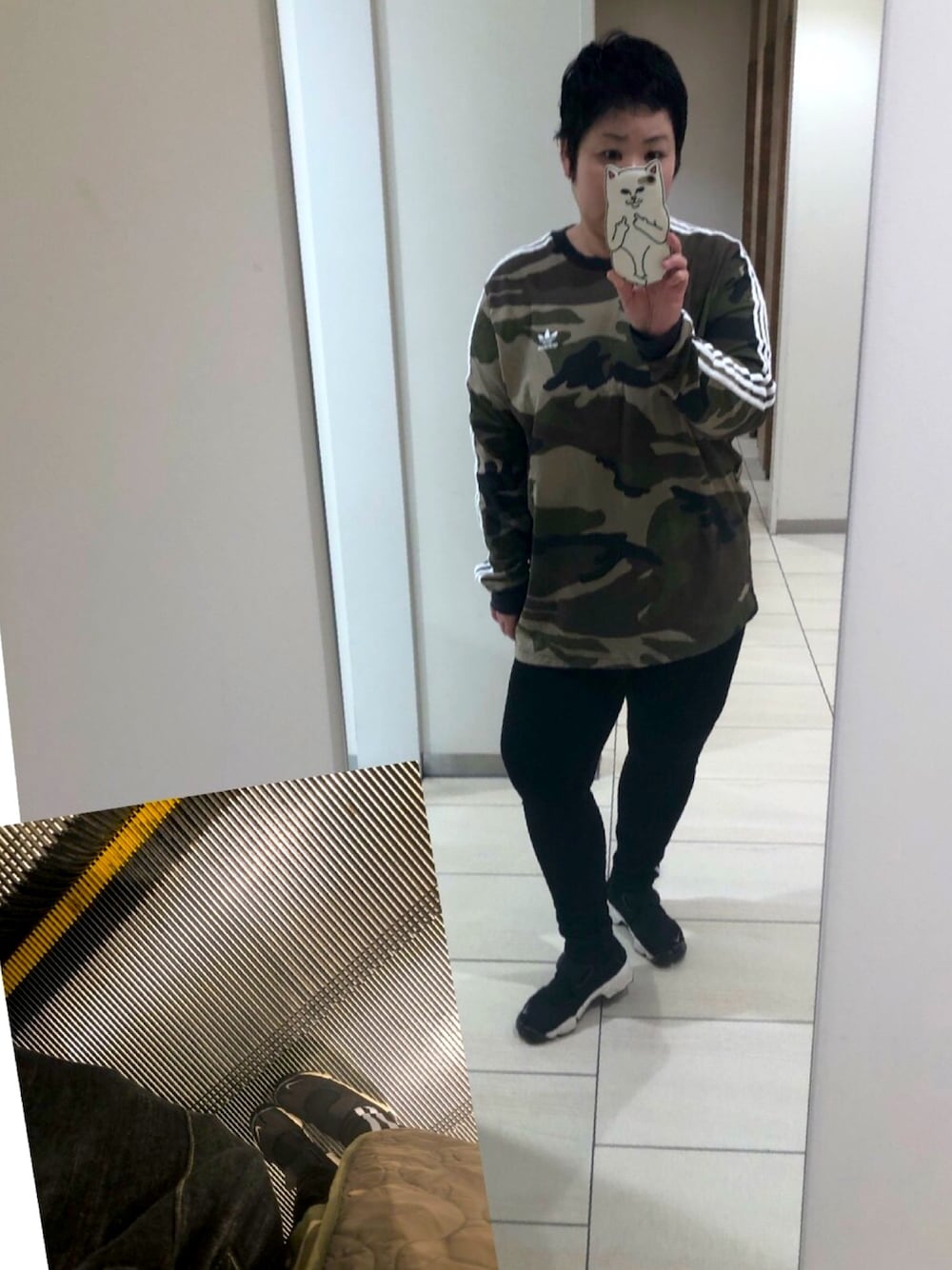 オーバーサイズ の アディダスのスリーラインロンTを ワンピース風にコデ スリーラインのカモ柄の オーバーサイズ と三拍子揃った 垂涎モノのロンTです うはうはです 高かったけどな……