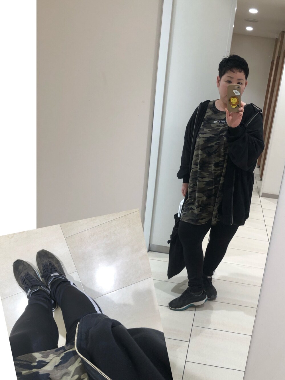 今日はちょっと 寒いですコデ☂️ ちょっと寒いので プニュズの ビッグパーカーを 合わせますた プニュズのパーカーも SHEINのカモフラ Tシャツも かなりビッグサイズで シルエットめちゃ良きです