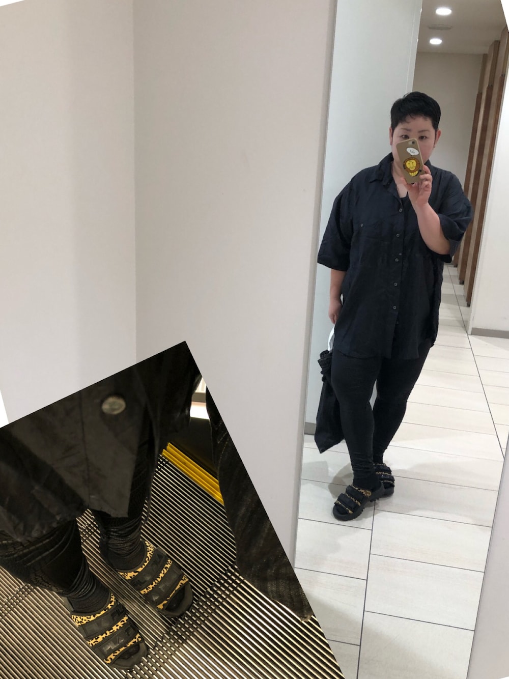 オーバーサイズの シルクシャツに エンボス加工レギンス コデ 締め付け感ゼロ ストレスフリーコデ ←いつもそうだ笑笑 不快指数高い時期なんで ストレスフリー大事🤔