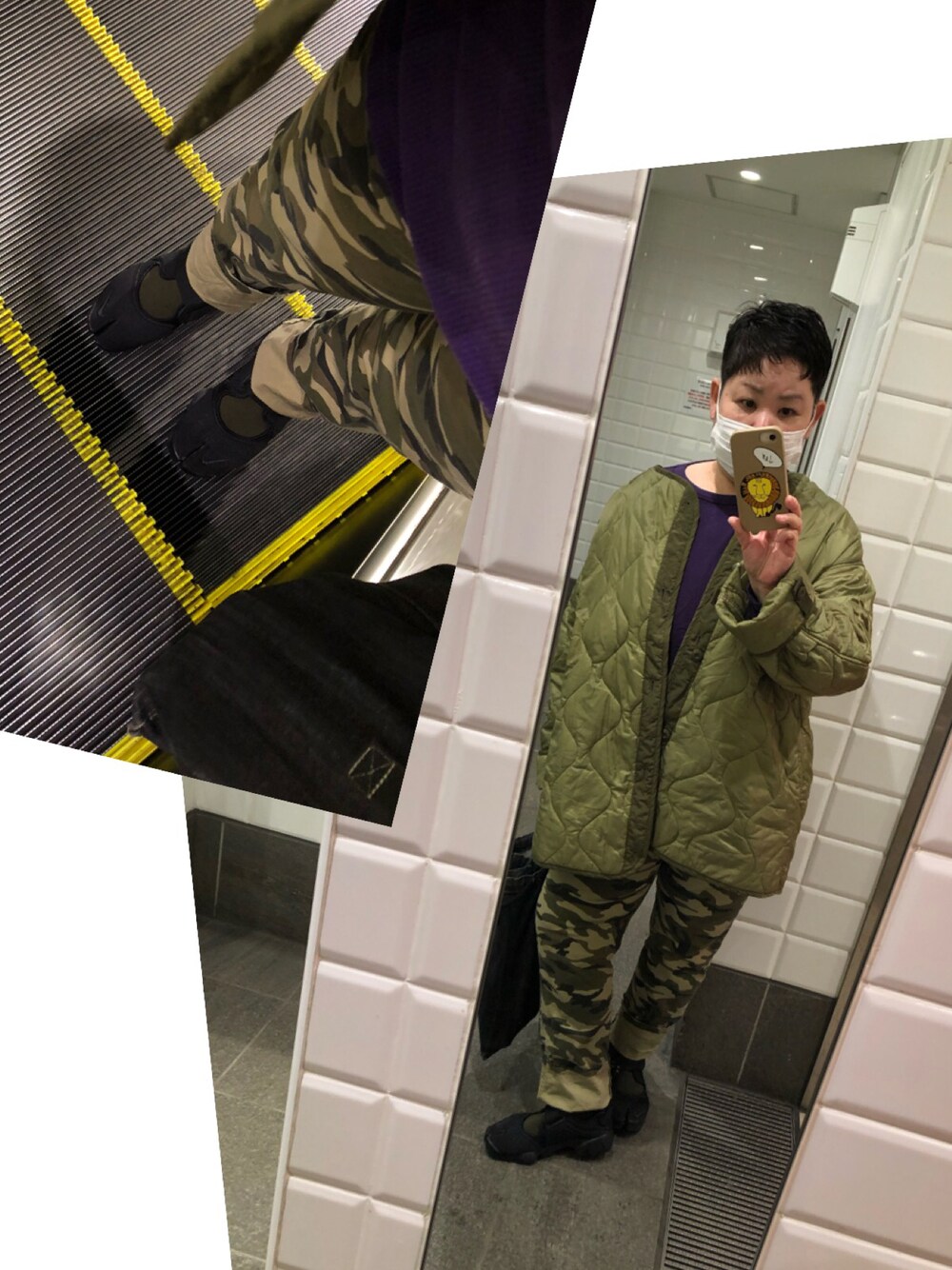 キルティングジャケット 迷彩柄パンツ ワッフルロンTでカーキ&紫コデ もう花粉キてますねーー 目がヤバい