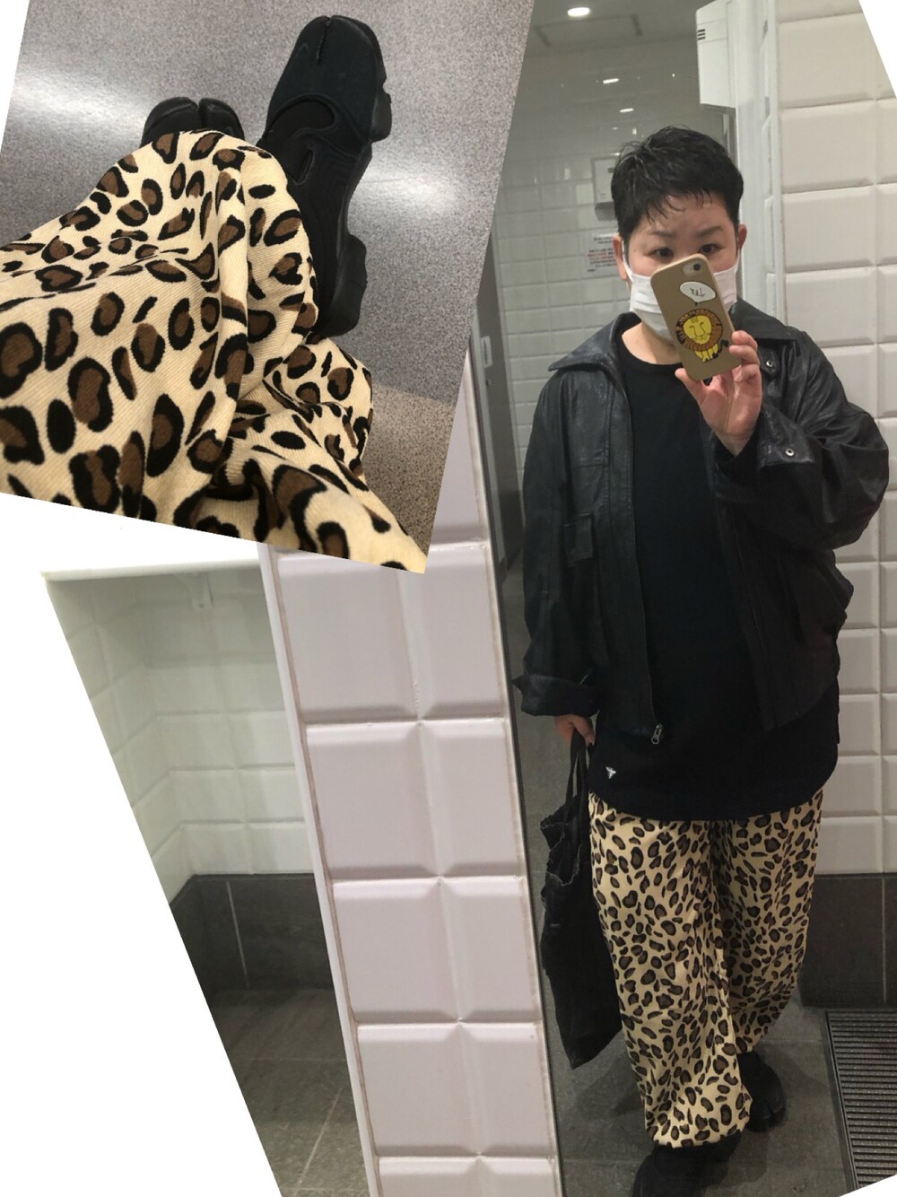今日も革ジャンと ヒョウ柄です コーデ このスウェットパンツ 素材がコーデュロイなんですよね そこが良い いつか大阪に行って ヒョウ柄にまみれるのが 夢です🐆🐆🐆