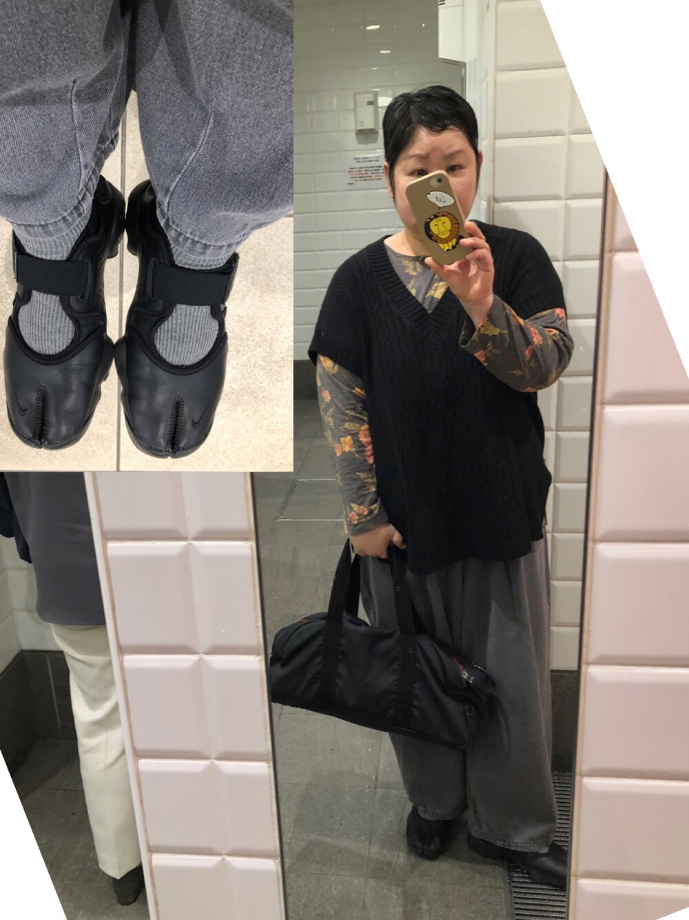 グレーのデニムに 花柄トップスに 黒ベストコデ 今日は初夏の陽気で 脳がバグります☀️