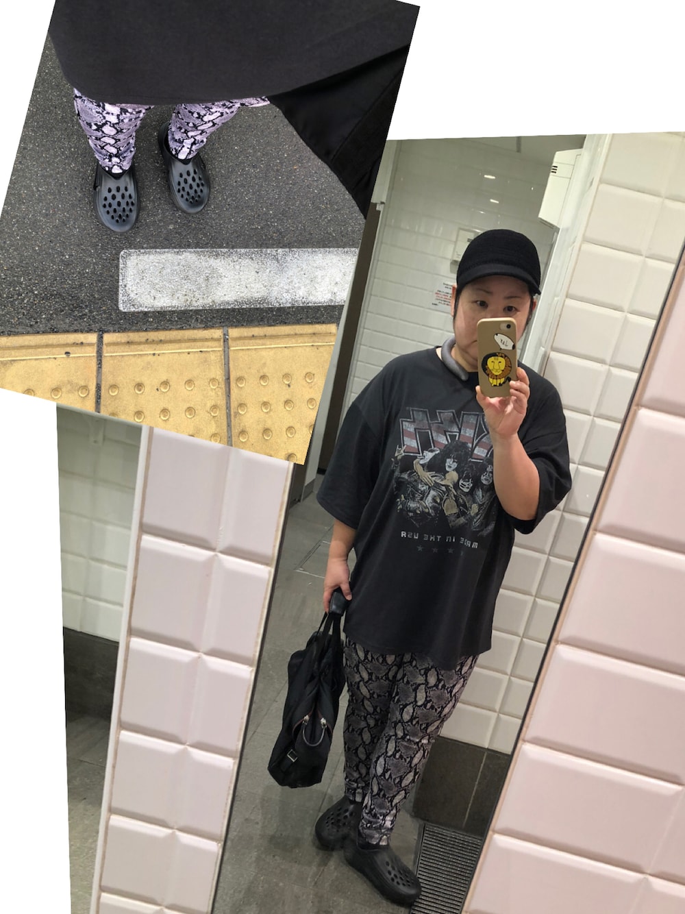 KISSのバンドTと パイソン柄レギンスでロックコデ⚡️⚡️ 格好は気合いが入ってますが 本人はへろへろです 白旗です🏳️ まだ後4日も働くのかーー クソボケが←ずんだもん風に