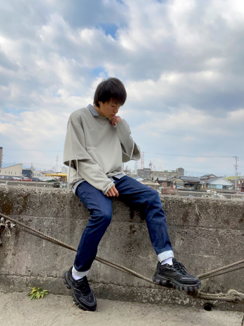 空飛ぶぺんぎんのスウェット「ビッグシルエット クオリティーブライト裏毛 レイヤードプルオーバースウェット/EMMA CLOTHES」を使ったコーディネート