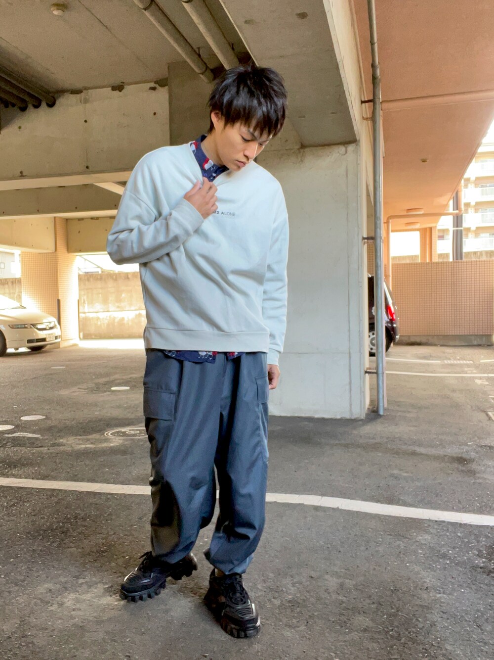 空飛ぶぺんぎんのスウェット「ビッグシルエットポンチプルオーバーロゴスウェット(LEAVE MΣ ALONE)」を使ったコーディネート