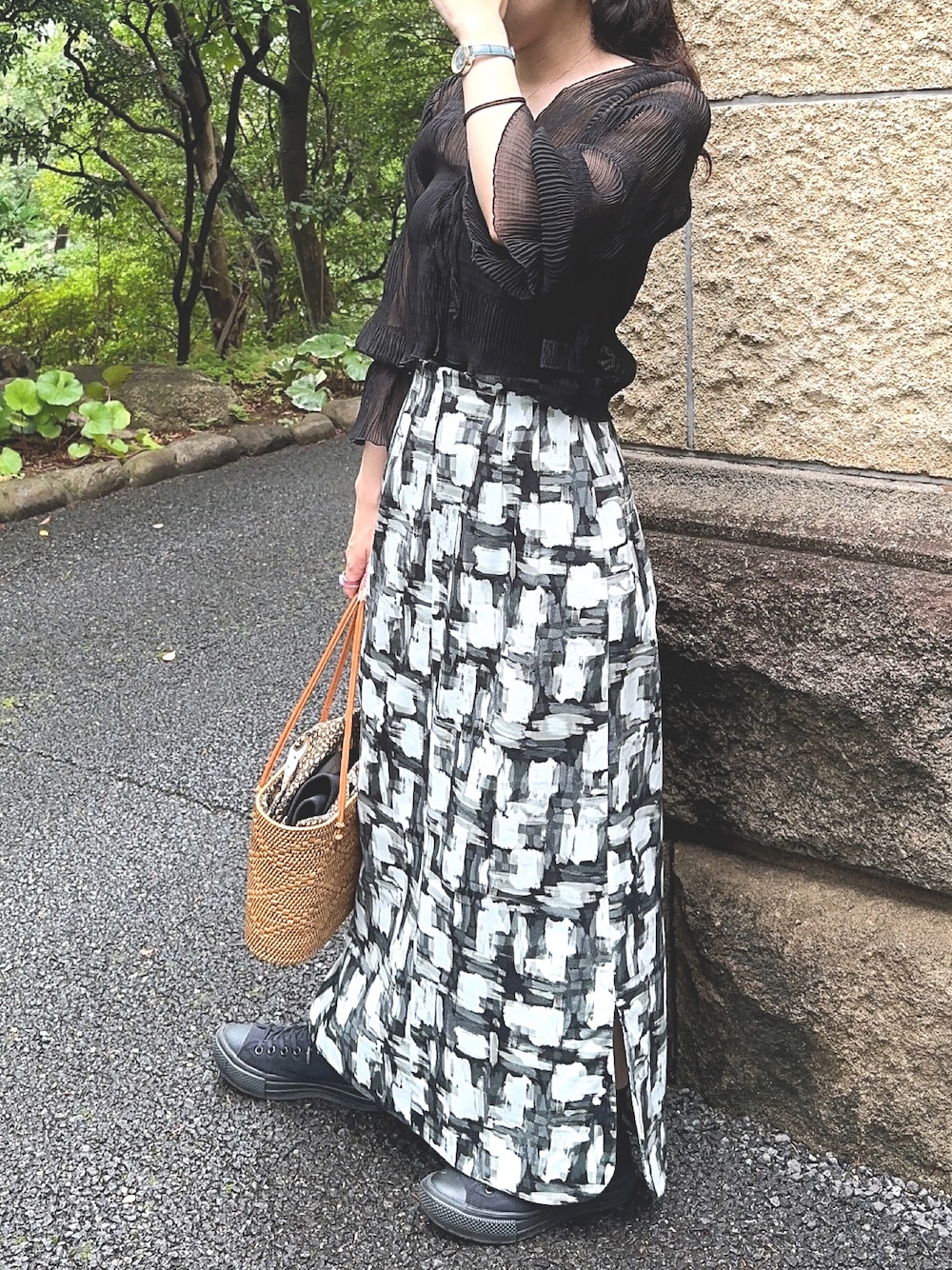 リムアークのスカートお気に入りです。全然着ていなかったので久々着てみました。 今シーズンお気に入りのmline のシアーブラウス、使い勝手がよくて着回しまくり☺️