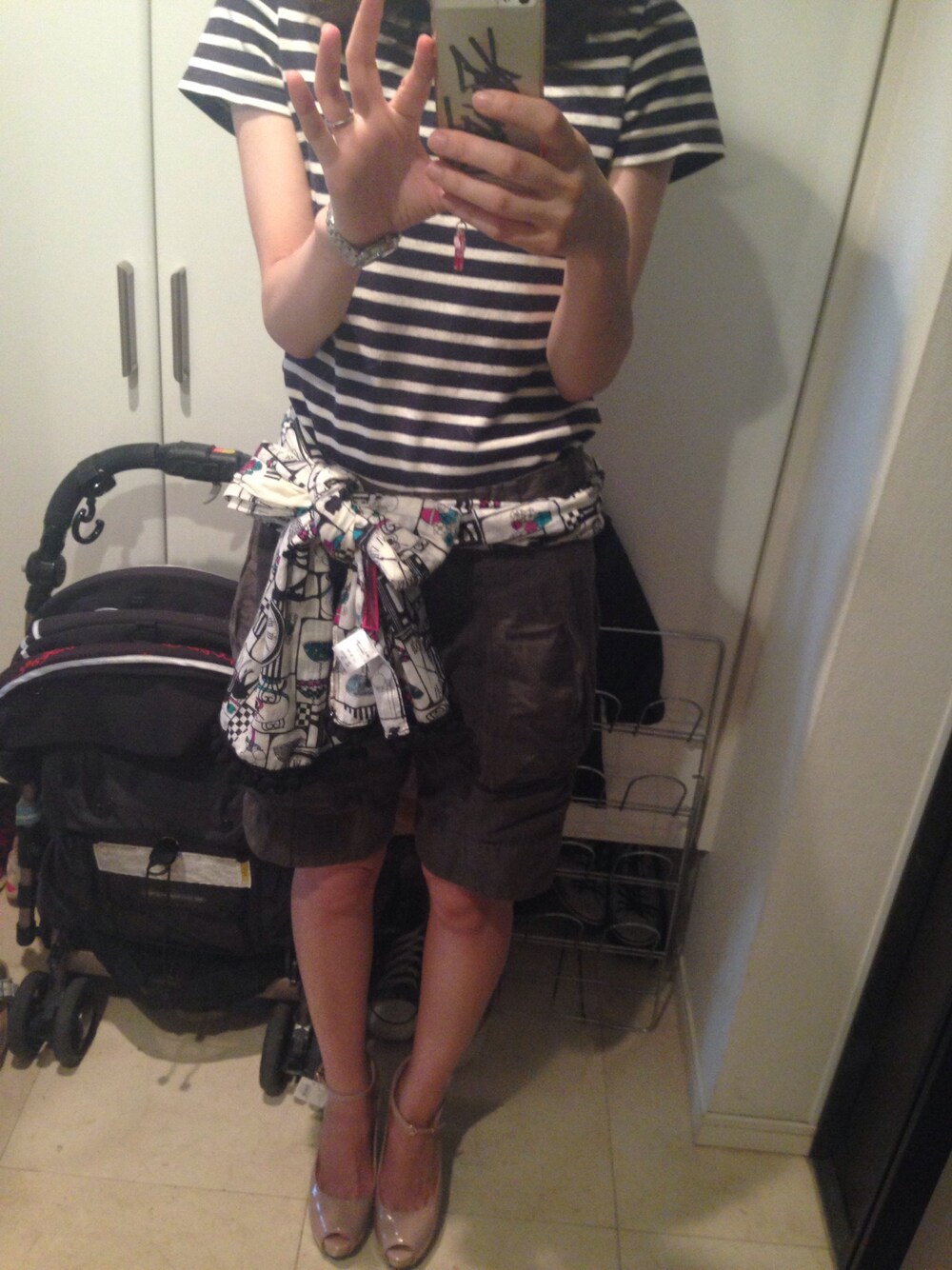ハーフパンツの付属のリボンがしわしわだったので手持ちのストールをベルト替わりにして見ました。 全体的に男っぽい感じになったので足元にヒールを合わせて見ました。