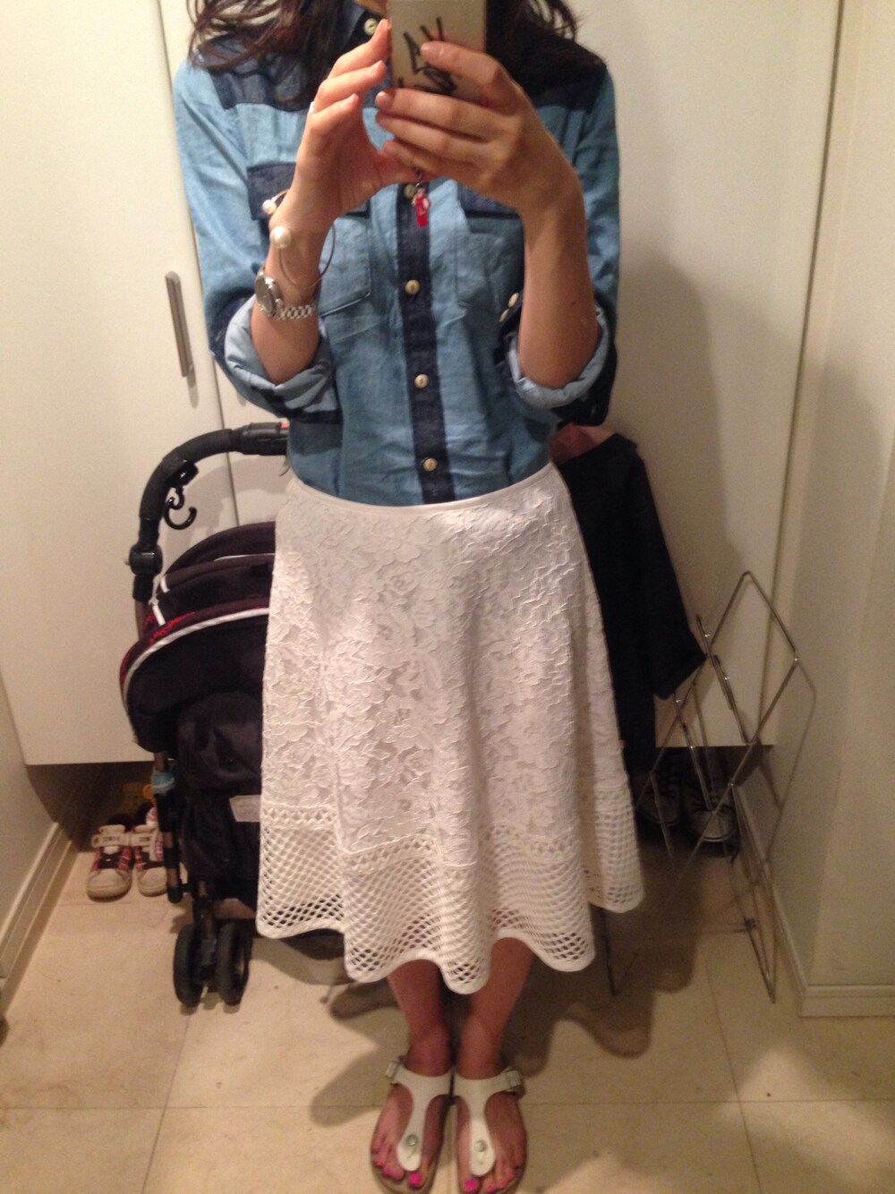 格安コーデバトル!デニムシャツ70%OFF、パールアクセ総額3000円、レーススカート2500円位だったと思います(笑)