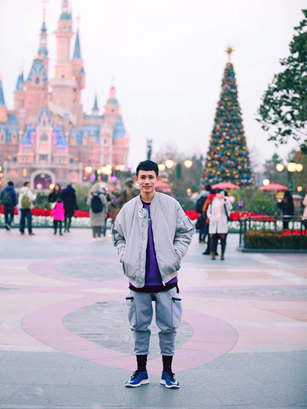 パープル系のパーカー、グレー系のチノパンツ、ブルー系のスニーカーを着用したメンズの冬コーディネートの1枚目の写真