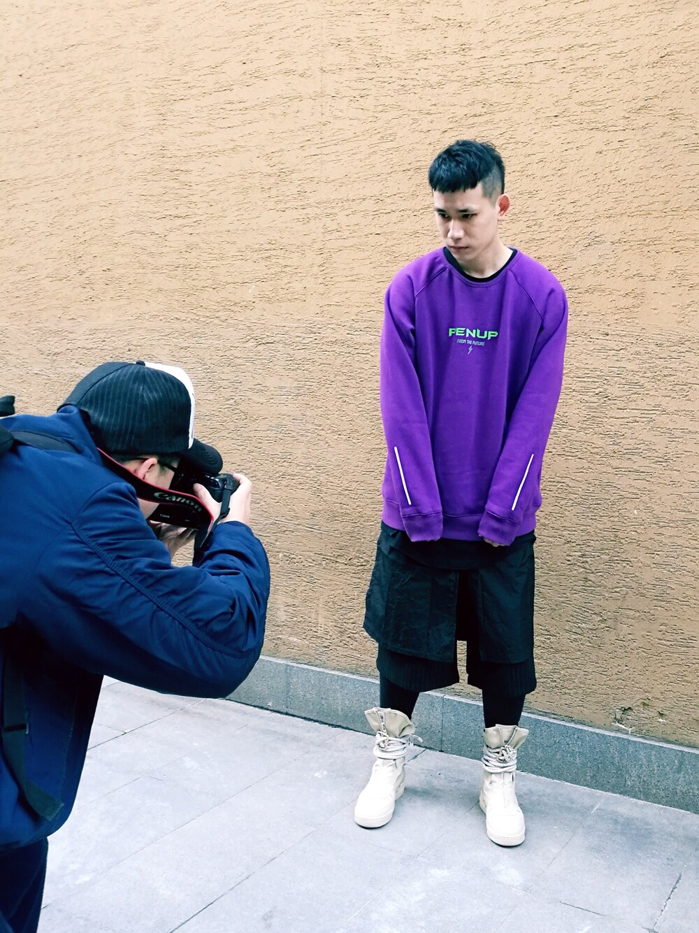 パープル系のパーカー、ベージュ系のスニーカーを着用したメンズの冬コーディネートの1枚目の写真