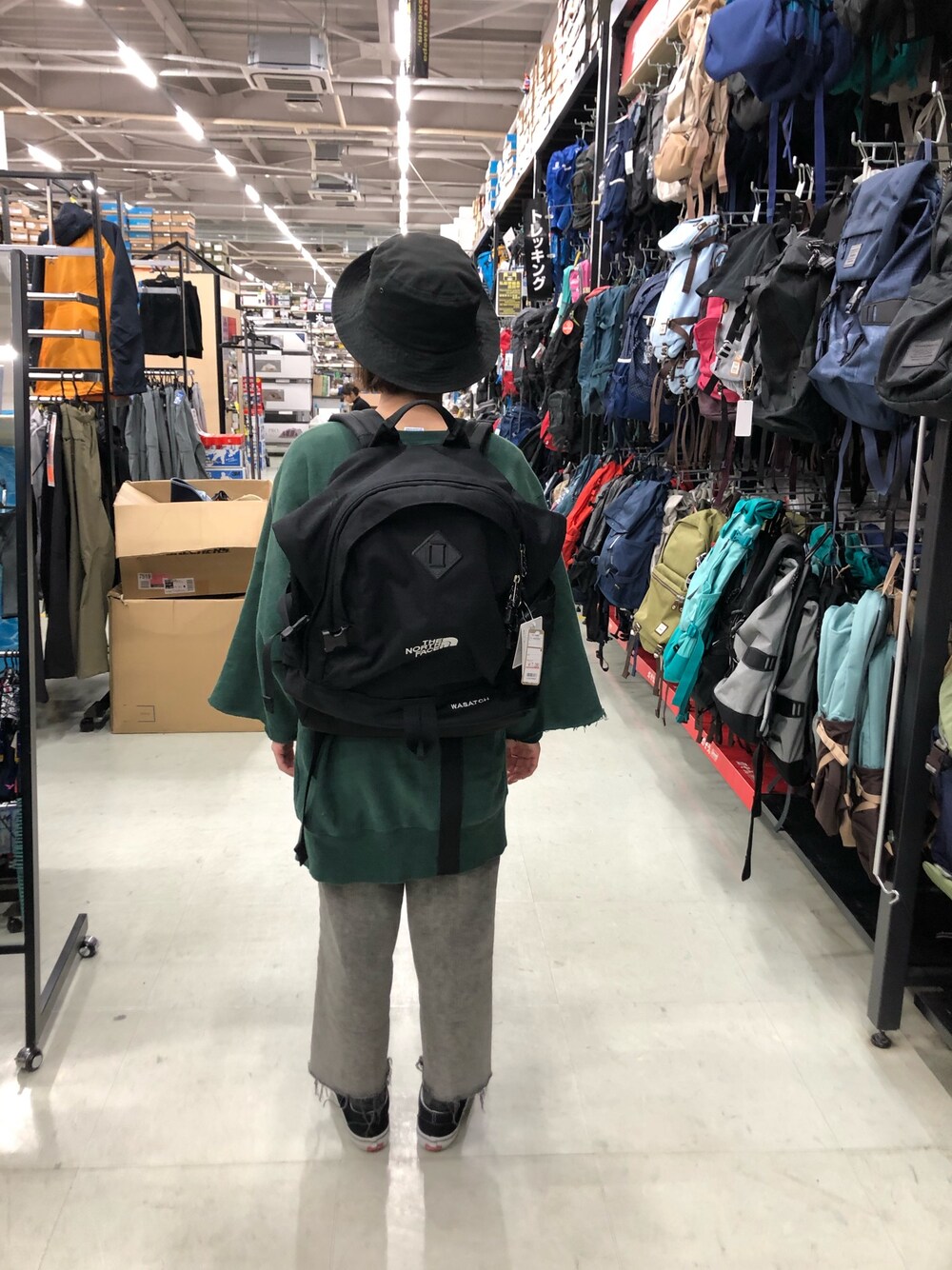 相方のトレッキングシューズを見に行ったのに、わたしのバックパック買ってもうた。。 試着時の写真、後ろ向きで失礼します🙄