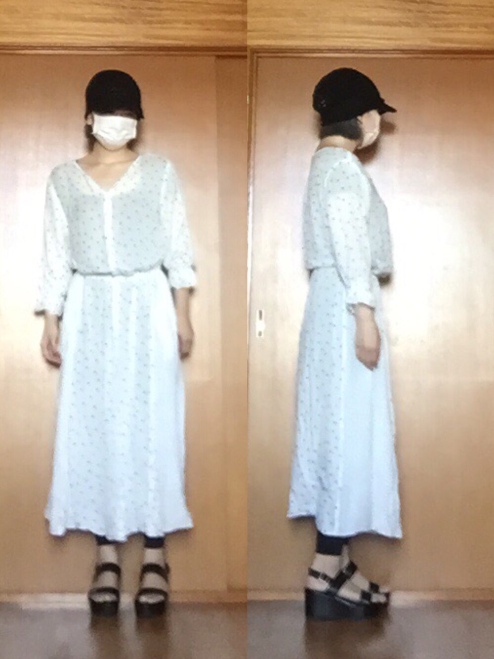 見て下さり、ありがとうございます😊 夏セールで買ったのはドットワンピです。 ドットの大きさが派手すぎず違うのがかわいい💕 しかし、これはワンピというか羽織感覚ですね。 裏地がついてないから、ワンピとして着るならレギンスやペチコートが必須です。 着圧腹巻のアレでインナーは黒にしました。 本当はスニーカーと合わせたかったのですが、レギンスとだとうまくバランスが取れないかなと思い、 サンダルにしました。